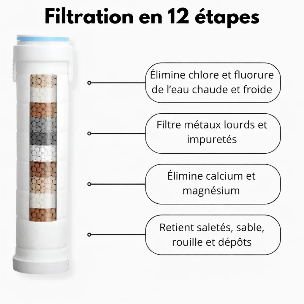 Le filtre intégré débarrasse votre eau du chlore et du calcaire, pour des cheveux et une peau protégés contre la sécheresse et les irritations.